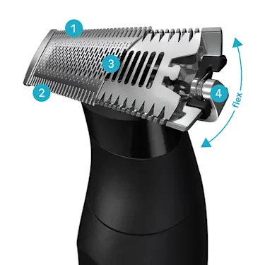 Obține cu ușurință rezultate minunate și linii precise, chiar și în zonele problematice, cu capătul Flex pivotant și lama bidirecțională care tunde în orice direcție.